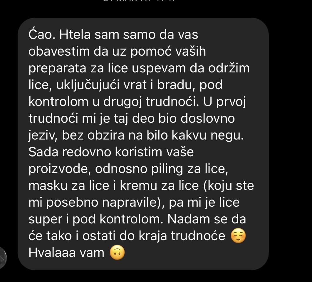 Koristim brend Kozmetika Moja već skoro godinu dana. Ni u jednom momentu se nisam premišljala da li da predjem na drugi brend. U svakom momentu kada sam imala problem sa licem, njihova kozmetika ga je sanirala kroz par meseci. Izdvojiću par proizvoda kao nešto što je definitivno spasilo moju kožu a to su: